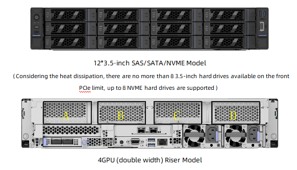 | Storage Options | Front: Supports up to 12*3.5-inch hard drives, compatible with NVMe hard drivesBuilt-in: 2 SATA/PCLe M.2, 1 onboard EMMC chip |