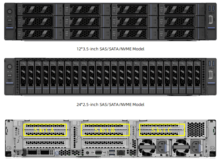 | A12000 AB22 | 12*3.5″ drives(SATA/SAS)2*USB3.0+1*VGA | 4*2.5″ drives(SATA/SAS/NVME)4*x8+2*x16 PCIE 5.01*RJ45 management interface2*USB3.01*VGA 1300W redundant power | 2* Heat Sinks,TDP≥270W 2*raid card connection cable, adapted to 95 series raid cards 12*3.5 hard drive bracket,compatible with 2.5″ drives 4*2.5 inches hard bracket |